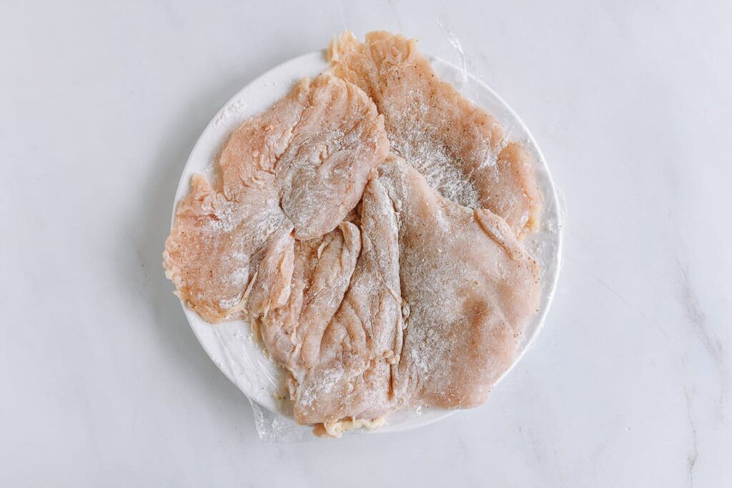 Si el pollo está desparejo, puede machacarlo hasta que tenga un grosor uniforme. Seque el pollo con una toalla de papel. Sazone ambos lados de las piezas de pollo con sal y pimienta, y espolvoree con una capa ligera y uniforme de harina.