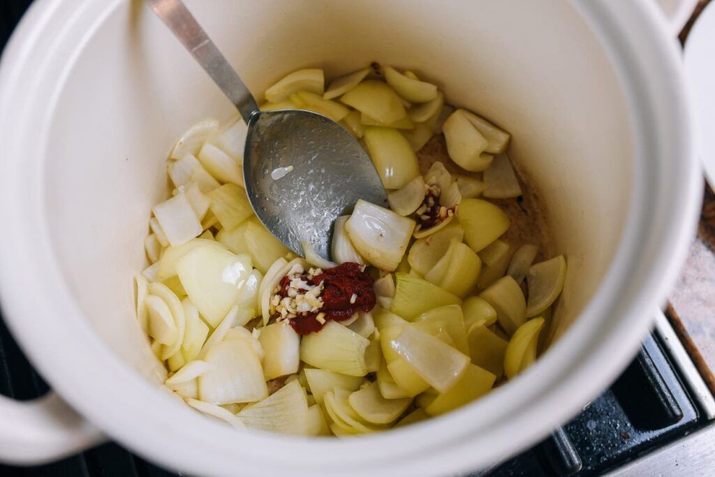 Caliente un horno holandés u otra olla mediana a grande a fuego medio. Agregue 1 cucharada de aceite y la cebolla, y cocine hasta que las cebollas comiencen a volverse translúcidas y los bordes comiencen a dorarse, aproximadamente 2-3 minutos.