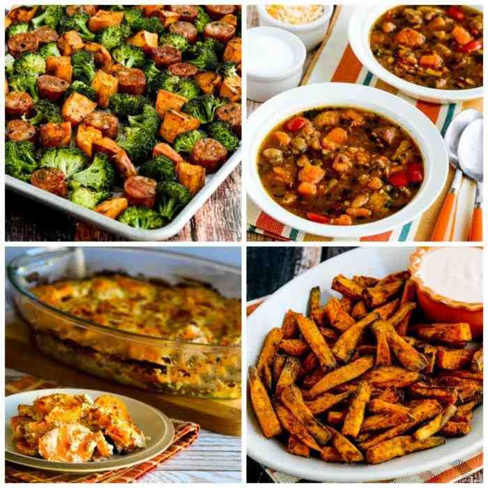 Bandeja de pan tostado con batatas, salchichas y brócoli es una receta que ha sido muy popular en el blog, y es fácil de hacer más baja en carbohidratos usando más salchichas y brócoli y menos batatas si lo prefiere.