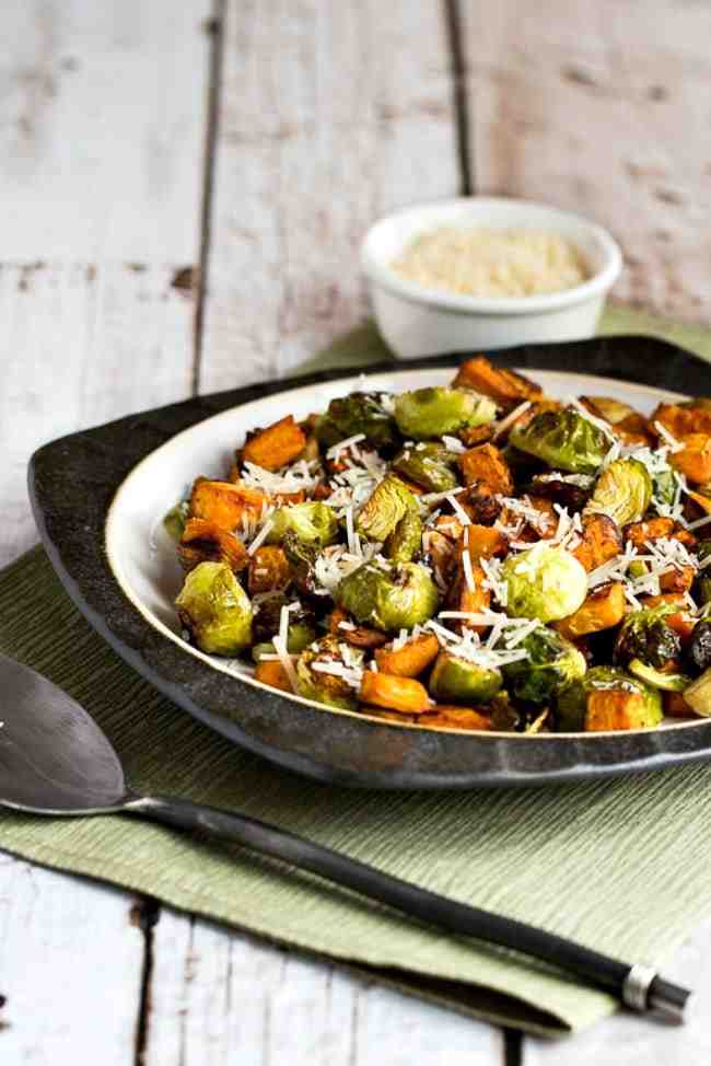 Patatas dulces asadas y coles de Bruselas es una deliciosa receta de camote para Acción de Gracias, o en cualquier momento que desee un acompañamiento especial. Y, por supuesto, puede usar solo unas pocas batatas y muchas más coles de Bruselas para reducir el contenido de carbohidratos.